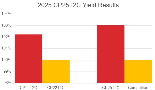 This hybrid has the owner organized and farmer field trial data from 2025 to back it up. Going head-to-head against some of the industries toughest TruFlex hybrids, CP25T2C didn’t back down and brought home the win. A smattering of these results is found below.